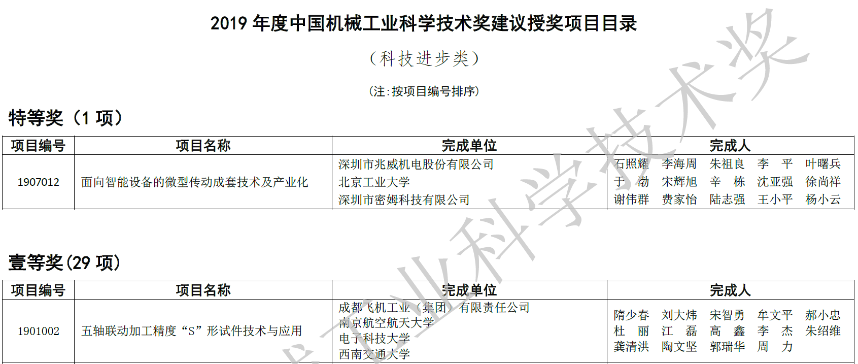 2019年10月11日,中國機械工程學會官網(wǎng)發(fā)布了《關(guān)于表彰2019年度中國機械工業(yè)科學技術(shù)獎獎勵項目的通報》,其中我司與北京工業(yè)大學、深圳市密姆科技有限公司聯(lián)合開展的項目---面向智能設(shè)備的微型傳動成套技術(shù)及產(chǎn)業(yè)化,榮獲科技進步獎特等獎(證書編號 R1907012-02 頒獎信息:2019年度中國機械工業(yè)科學技術(shù)獎頒獎大會 http://www.cmiao.com.cn/cms/news/773.htm)。